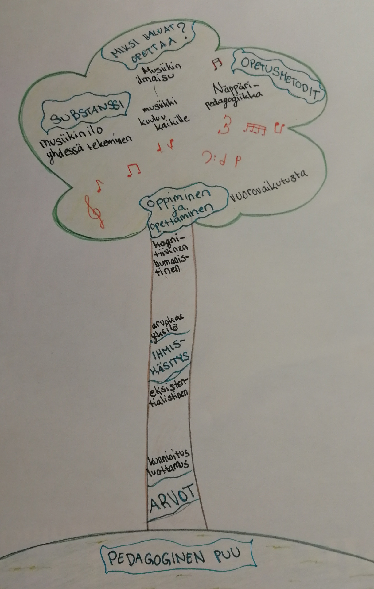 Pedagoginen puuni rakentuu tukevista juurista, vahvasta rungosta ja tuuheasta lehvästöstä. Puu kasvaa ja vahvistuu vuosien varrella. Puun juuret ja runko, eli opettajuuden perustana on arvot ja ihmiskäsitykset. Tärkeimpinä arvoina pidän opettaja-oppija suhteen luomista, toinen toisensa kunnioitusta ja luottamusta.
